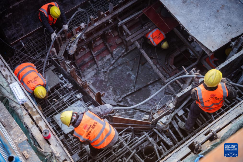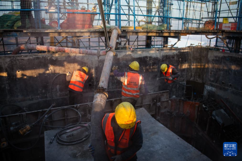 12月24日,中鐵十一局工人在P4主塔塔頂進(jìn)行混凝土澆筑施工作業(yè)。