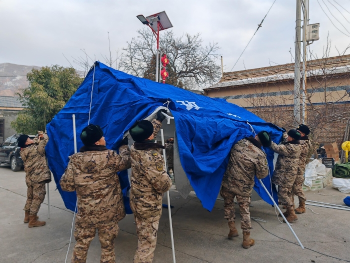 12月20日,武警甘肅總隊臨夏支隊官兵在積石山縣劉集鄉(xiāng)高李村搭建帳篷。