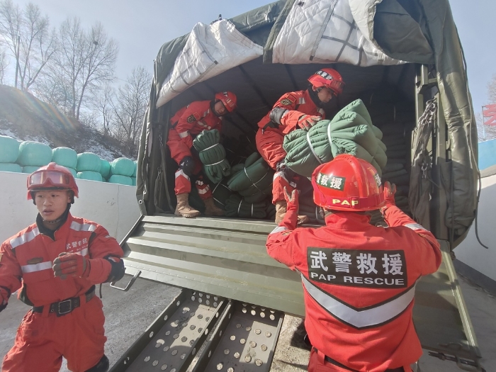 12月20日,武警甘肅總隊機動支隊官兵在積石山縣劉集鄉(xiāng)崔家村搬運救災(zāi)被褥。