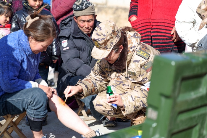 12月20日,陸軍第76集團(tuán)軍某旅官兵在積石山縣石塬鎮(zhèn)安置點為受災(zāi)群眾提供醫(yī)療服務(wù)。