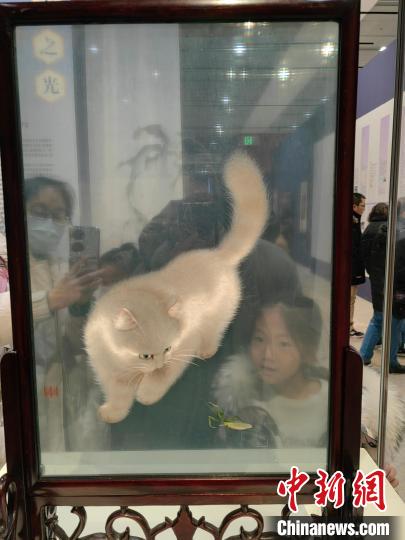 “蘇繡藝術(shù)文獻(xiàn)展(1949-2019)”現(xiàn)場(chǎng)展出的雙面繡代表作《白貓戲螳螂》。應(yīng)妮攝
