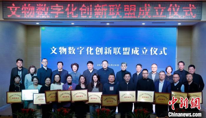 12月24日,文物數(shù)字化創(chuàng)新聯(lián)盟成立大會(huì)在北京舉辦。圖為15家文物數(shù)字化創(chuàng)新聯(lián)盟成員單位獲授牌。記者 富田 攝