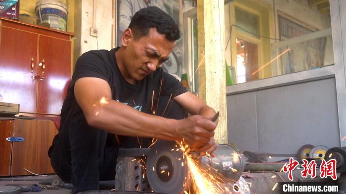 阿卜杜拉·阿卜杜賽麥提在工作間打磨刀具。李明非攝