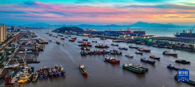 12月14日,浙江省舟山市普陀區(qū)沈家門漁港在落日余暉映照下美如畫卷(無人機(jī)照片)。