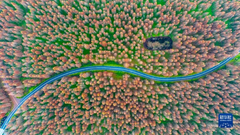 12月13日在湖南省資興市東江灣城市公園拍攝的水杉美景(無人機(jī)照片)。