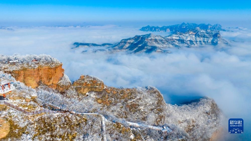 12月12日在河南省濟(jì)源市拍攝的雪后王屋山美景(無人機(jī)照片)。
