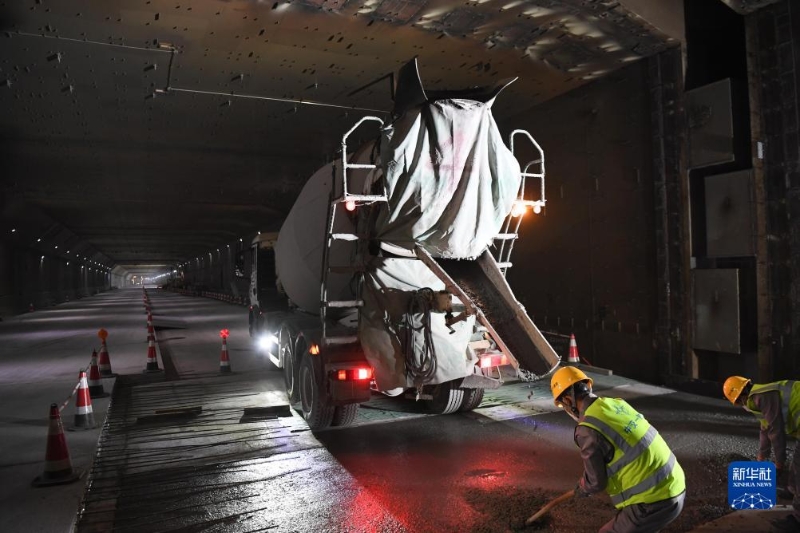 11月28日,工人在深中通道海底沉管隧道內(nèi)進(jìn)行最后的壓艙混凝土澆筑。