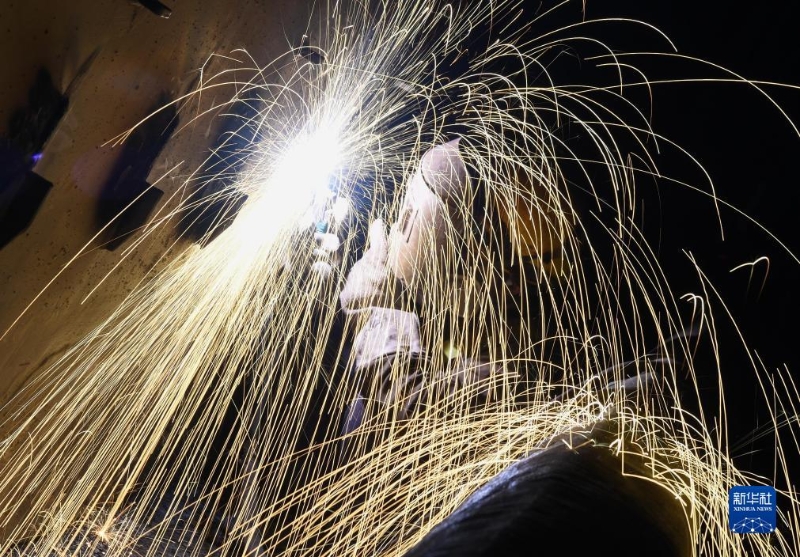 11月27日,工人在深中通道海底沉管隧道內(nèi)進(jìn)行切割作業(yè)。
