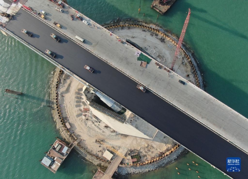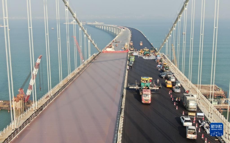 11月27日,保利長(zhǎng)大工人在深中通道伶仃洋大橋進(jìn)行路面鋪裝工作(無(wú)人機(jī)照片)。
