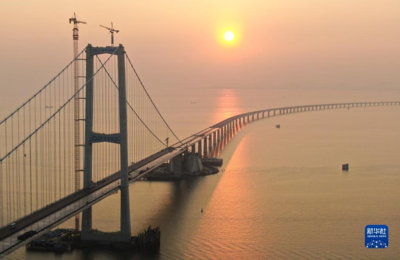 這是夕陽(yáng)下的深中通道伶仃洋大橋(11月27日攝,無(wú)人機(jī)照片)。
