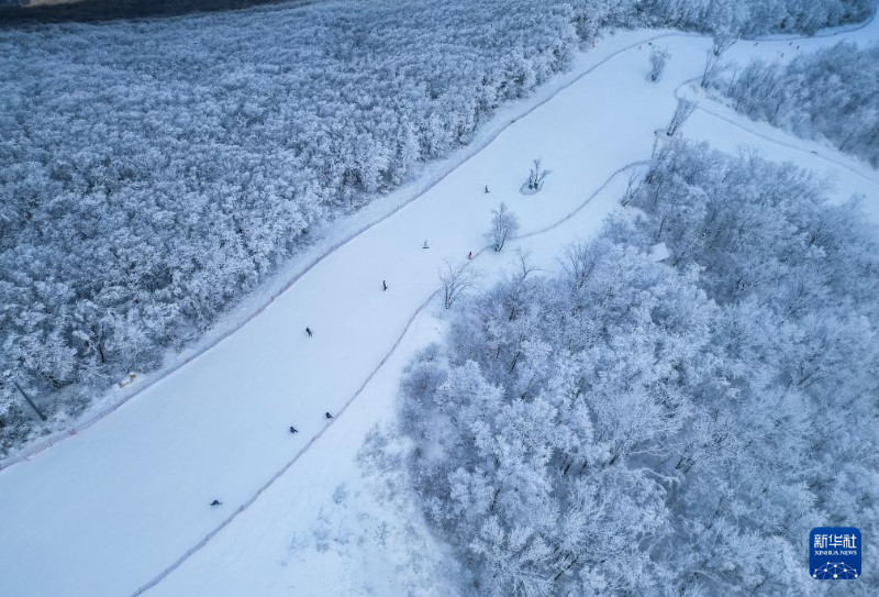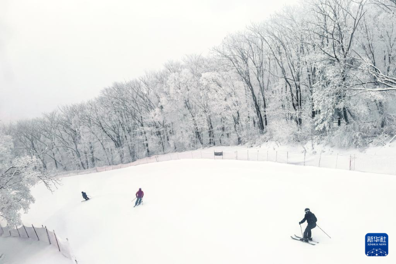 人們?cè)诩质〖质械娜f科松花湖度假區(qū)雪道上滑雪(11月29日攝,無人機(jī)照片)。
