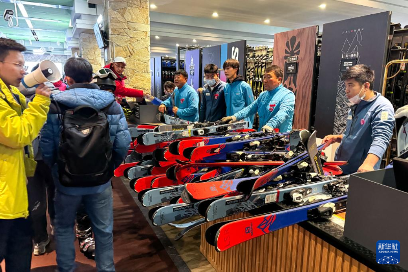 在吉林省吉林市萬科松花湖度假區(qū)雪具大廳內(nèi),工作人員為前來體驗(yàn)滑雪的游客發(fā)放雪具裝備(12月5日攝)。