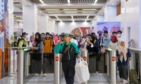 人們?cè)谌鹗坎蔂栺R特上火車(12月10日攝)。
