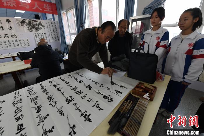 圖為書法家在蘭州交通大學附屬中學現(xiàn)場書法交流。戴文昌 攝