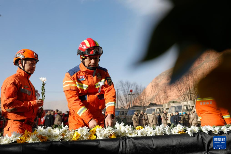 12月25日,在積石山縣大河家鎮(zhèn)大河文化廣場,參加悼念活動(dòng)的人員向遇難同胞獻(xiàn)花。