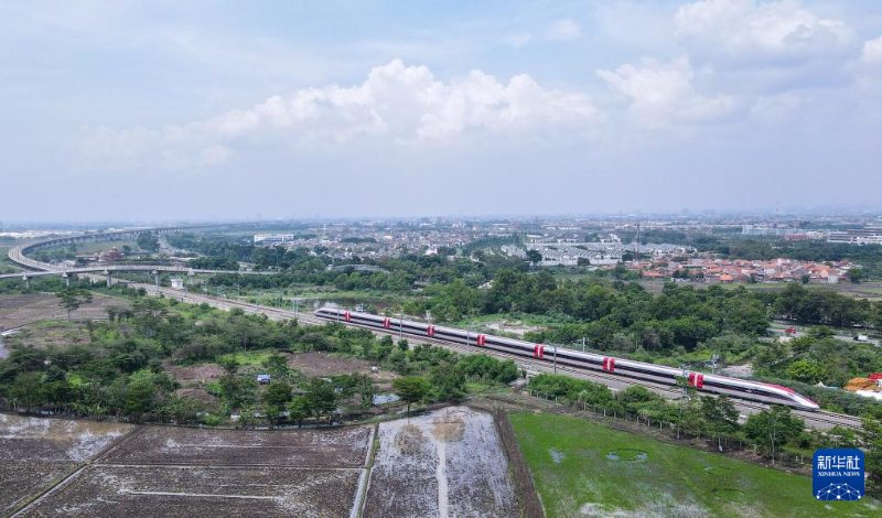 這是12月6日在印度尼西亞萬隆德卡魯爾車站附近拍攝的一列行駛中的雅萬高鐵高速動車組(無人機照片)。
