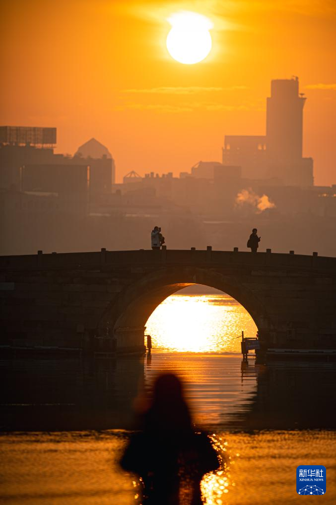 這是日出時(shí)分的杭州西湖斷橋景色(12月26日攝)。