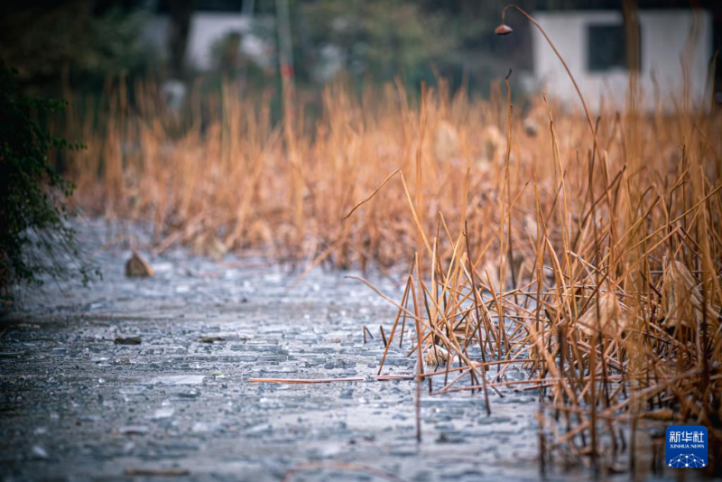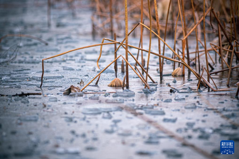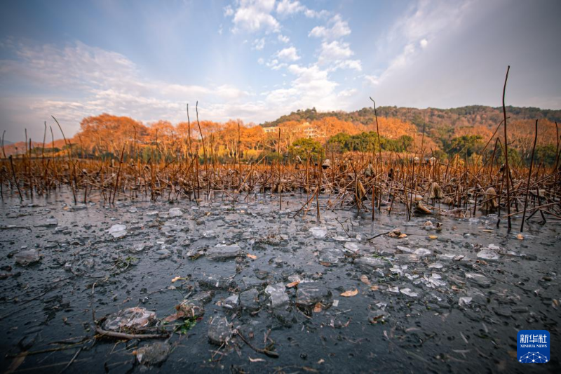 冬日,杭州西湖部分水域水面結(jié)冰,冰面、殘荷與朝陽共同構(gòu)成美麗畫卷。
