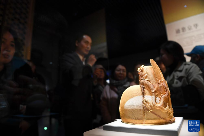 這是北京大運(yùn)河博物館“京華通惠 運(yùn)河永濟(jì)”北京與大運(yùn)河歷史文化陳列中展出的“金翼善冠”(12月27日攝)。