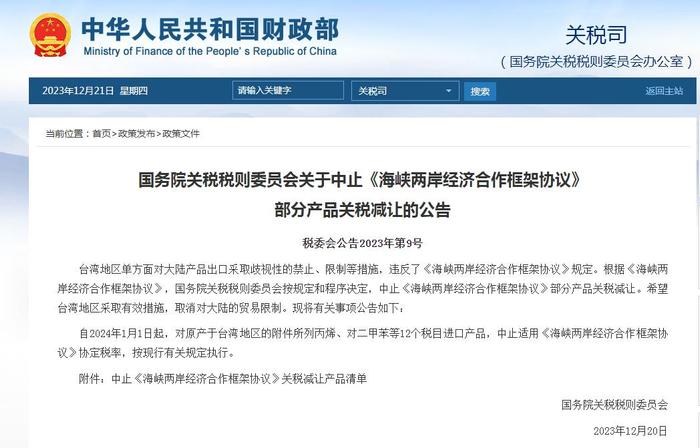 官方:中止《海峽兩岸經(jīng)濟(jì)合作框架協(xié)議》 部分產(chǎn)品關(guān)稅減讓