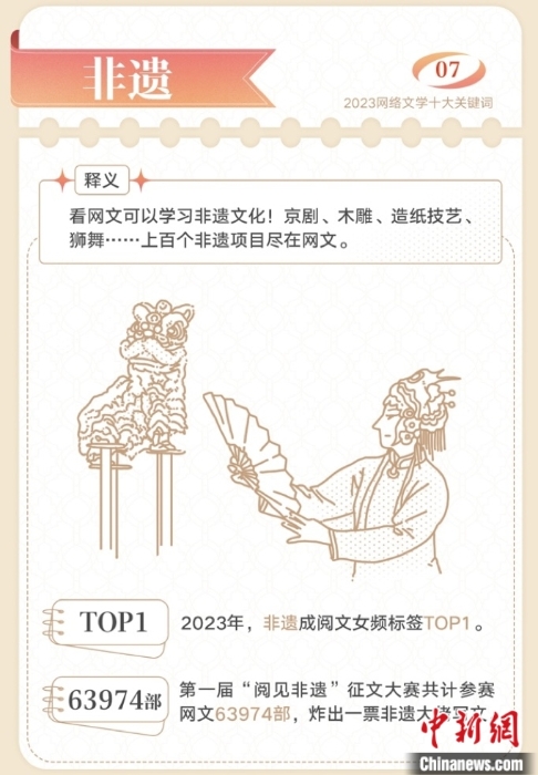 與此同時,網(wǎng)絡(luò)文學(xué)在高質(zhì)量傳承傳統(tǒng)文化方面持續(xù)發(fā)力。京劇、木雕、造紙、獅舞……上百個非遺項目在網(wǎng)文中掀起“傳統(tǒng)文化熱”,“非遺”躍升為閱文女頻標(biāo)簽TOP1。