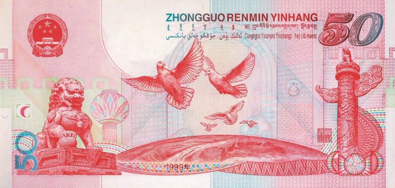 ↑1999年發(fā)行的慶祝中華人民共和國(guó)成立五十周年紀(jì)念鈔背面圖案,印有長(zhǎng)城裝飾圖樣。(中國(guó)印鈔造幣集團(tuán)有限公司供圖)