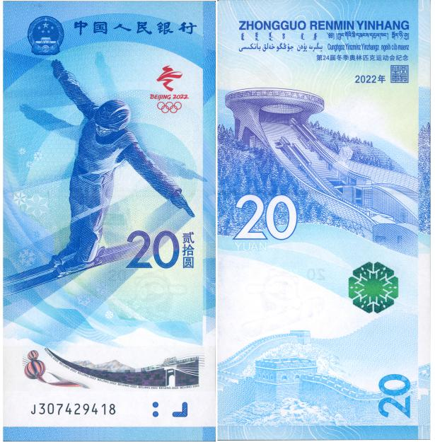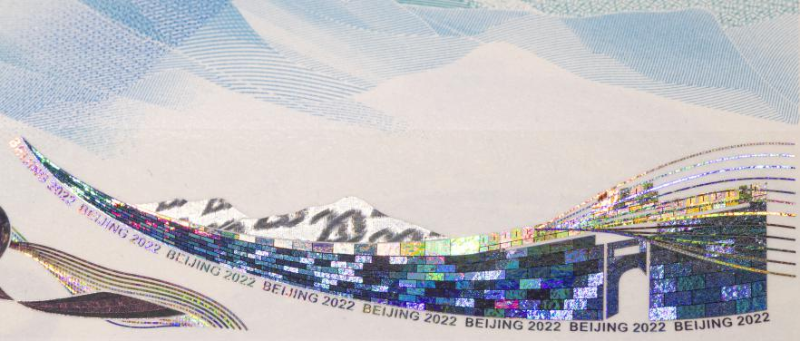 ↑2021年發(fā)行的第24屆冬季奧林匹克運(yùn)動(dòng)會(huì)紀(jì)念鈔——雪上運(yùn)動(dòng)項(xiàng)目,其將長(zhǎng)城形象應(yīng)用在動(dòng)感全息、膠印、熒光等多種防偽圖案中。(中國(guó)印鈔造幣集團(tuán)有限公司供圖)