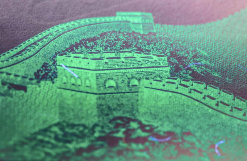 “通過(guò)‘長(zhǎng)線短刻’的手法,我們讓刻刀下的長(zhǎng)城形成了‘線短勢(shì)不斷’的觀感,而空間透視的手法,則給予人們充足的想象空間,仿佛在這一張紙幣上就能看到長(zhǎng)城綿延萬(wàn)里的景象?!被ㄈ鹚烧f(shuō)。
