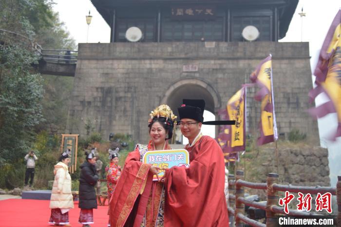 中新網(wǎng)廣元12月28日電(苗志勇 王春波)鼓樂齊鳴,鸞歌鳳舞。28日上午,四川省廣元市劍閣縣劍門關景區(qū)北門廣場滿堂紅妝,喜氣洋洋,來自全縣各行各業(yè)的100名青年人才身著紅火的漢式傳統(tǒng)婚服齊聚于此參加集體婚禮,吸引了眾多觀禮嘉賓前來見證和祝福。