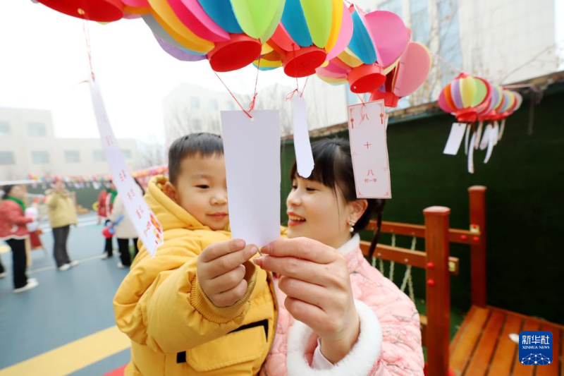 ??12月30日,在山東省濱州市惠民縣一所幼兒園,小朋友和家長一起猜燈謎。
