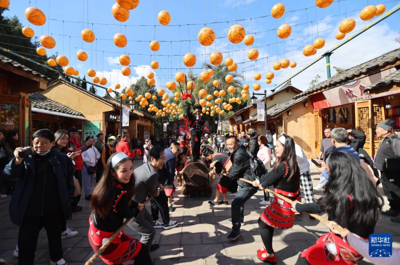 ??12月30日,在云南省昆明市云南民族村,游客與佤族演員一起體驗拉木鼓。