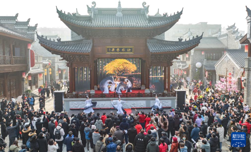 ??12月30日,游人在湖北省襄陽市古城內的管家巷文化休閑街區(qū)觀看演出(無人機照片)。