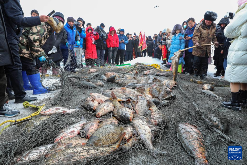 ??12月30日,游客在河北省沽源縣庫倫淖爾湖冰面上觀看冬捕。