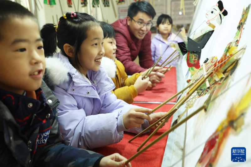 ??12月30日,在河北省唐山市豐潤區(qū)太平路街道錦祥社區(qū),皮影藝人指導小朋友表演皮影戲。