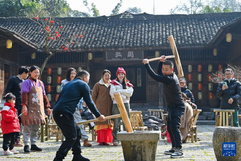 ??12月30日,游人在重慶市酉陽土家族苗族自治縣桃花源景區(qū)體驗打糍粑。