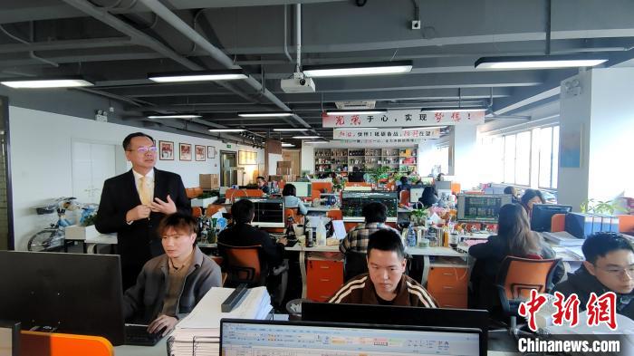 2023年12月21日,吳家瑩(左一)在公司指導業(yè)務。中新社記者 楊伏山 攝