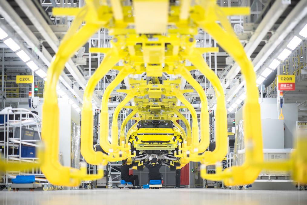 2023年1月11日,在位于湖北省武漢市經(jīng)開區(qū)智能網(wǎng)聯(lián)和電動(dòng)汽車產(chǎn)業(yè)園的路特斯全球智能工廠,工人在流水線上作業(yè)。