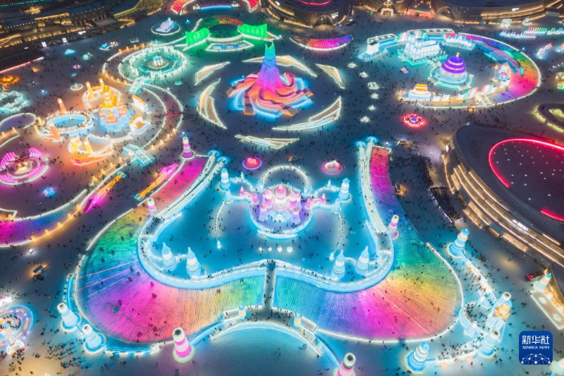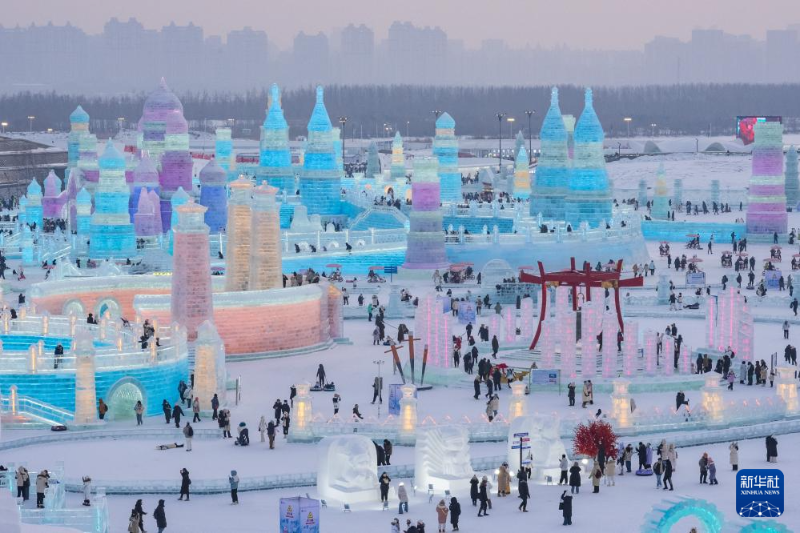 1月1日,游客在哈爾濱冰雪大世界園區(qū)內(nèi)游玩(無人機(jī)照片)。