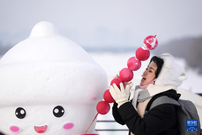 1月1日,在哈爾濱太陽島雪博會園區(qū),工作人員與游客互動。