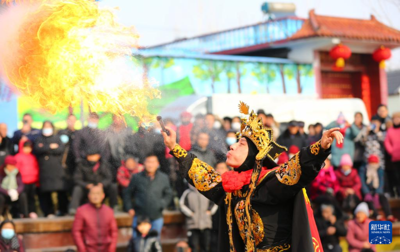1月1日,在山東省滕州市西崗鎮(zhèn),民間藝人在表演“噴火”絕活。