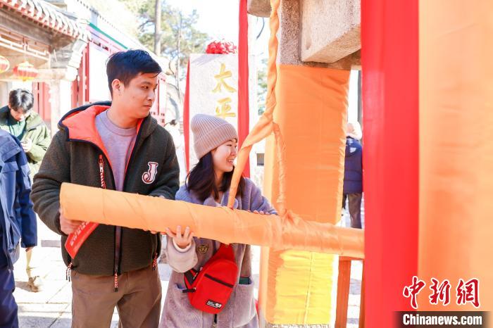 一對(duì)游客在青島嶗山風(fēng)景名勝區(qū)通過敲鐘鳴曉祈福新年。趙斌 攝
