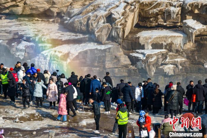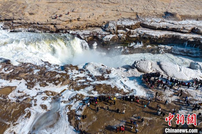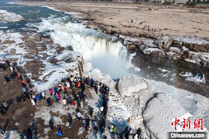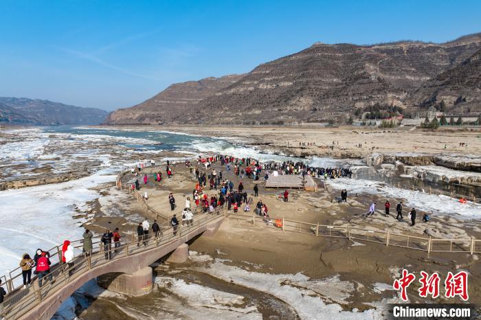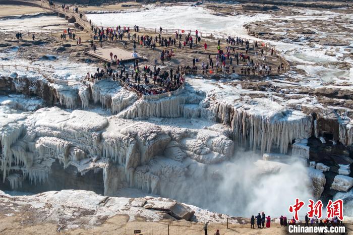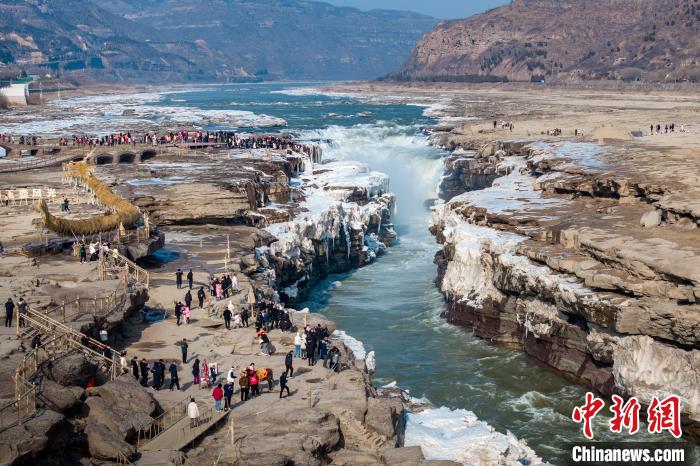 冬季的黃河壺口瀑布,河水滔滔,奔流不息,氣勢磅礴。此時瀑布水色由黃轉(zhuǎn)為翠綠,拍擊河岸,激起層層浪花,白霧躍然升騰,在兩岸石壁上掛起了晶瑩剔透的冰掛,吸引眾多游客前往觀賞。元旦假期,當?shù)孛袼姿嚾松碇⒀b,表演非遺民俗,在黃河岸邊打起壺口斗鼓,迎八方游客。