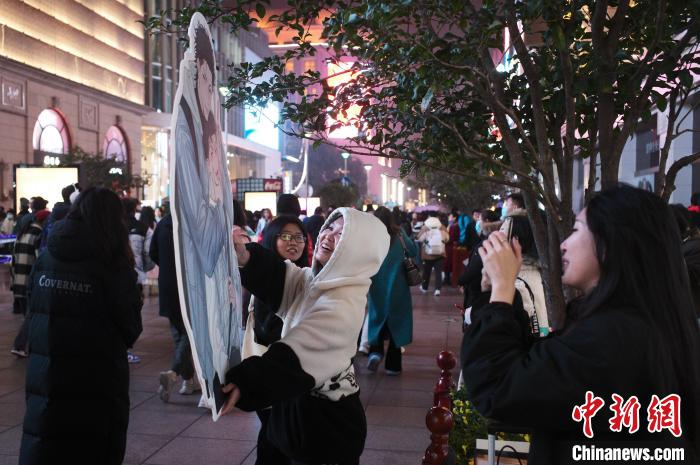 游客在南京東路步行街上拿著廣告牌合影。中新網(wǎng)記者 殷立勤 攝