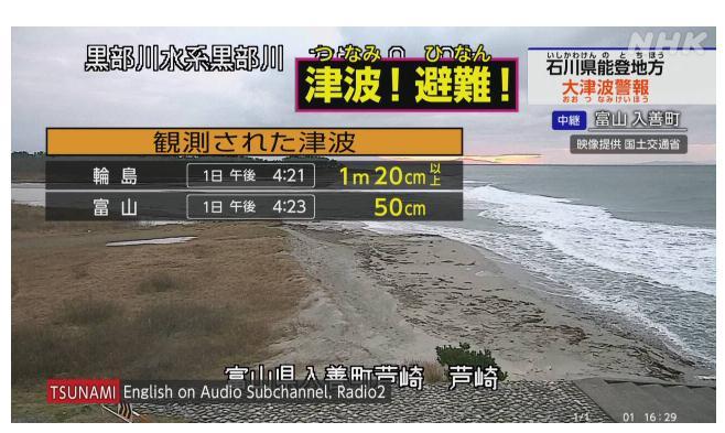 另據(jù)日本放送協(xié)會(NHK)報道,日本氣象廳最新消息稱,石川縣的輪島港觀測到1.2米高的海嘯。