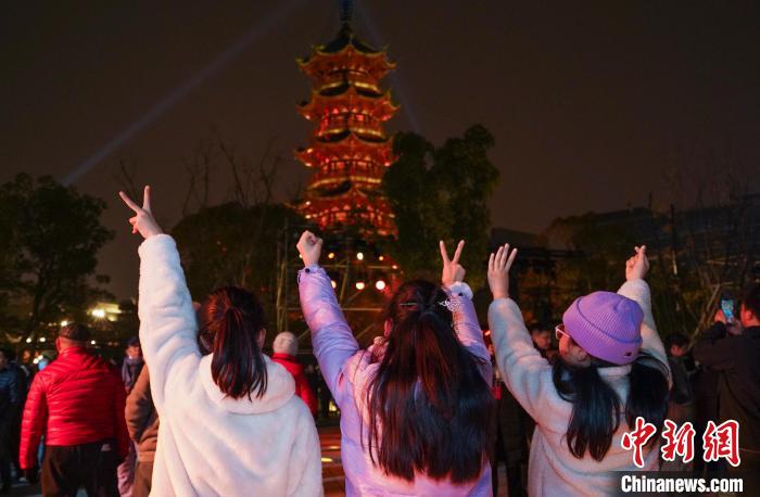 在迎新納福的喜慶氛圍中,上海市民游客用手機相機定格下千年古塔的璀璨時刻、辭舊迎新的難忘瞬間。(完)