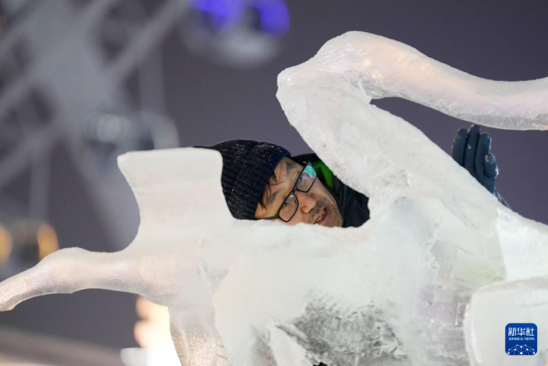 1月2日,在冰雪大世界園區(qū)內(nèi),參賽選手在進(jìn)行冰雕創(chuàng)作。