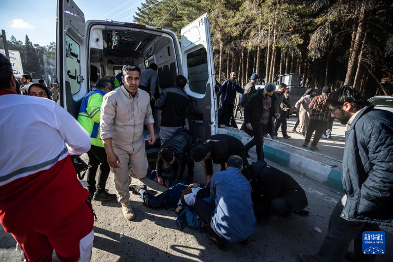 1月3日,在伊朗克爾曼市,醫(yī)護(hù)人員在爆炸事故現(xiàn)場附近搶救傷員。