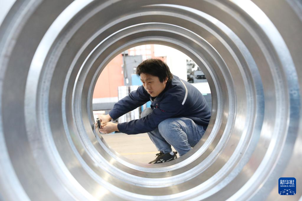 1月3日,在河南省焦作市溫縣一家機(jī)械設(shè)備制造企業(yè),工人在車間測(cè)量數(shù)據(jù)。