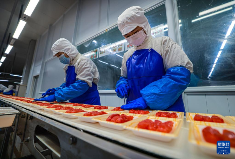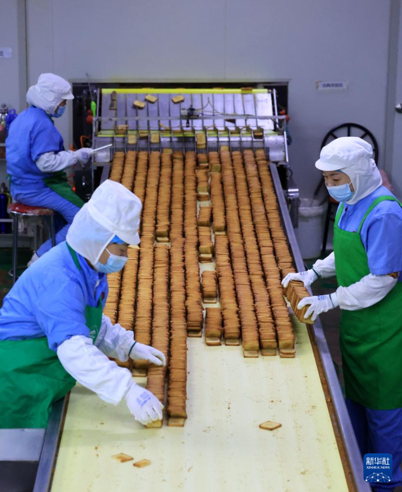 1月3日,在河北省石家莊市欒城區(qū)一家食品生產(chǎn)企業(yè),工人在流水線上工作。