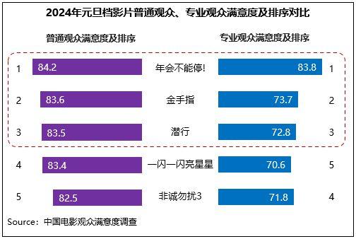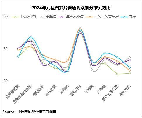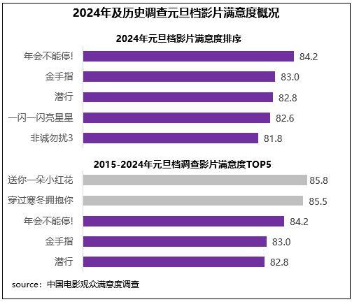 中國電影觀眾滿意度調(diào)查?2024年元旦檔調(diào)查結(jié)果顯示,元旦檔電影觀眾滿意度得分83.0分,環(huán)比增長0.2分。檔期以多元化且高契合度的影片供給陪伴觀眾跨年,得到了較高的滿意度評(píng)價(jià),5部影片中有4部進(jìn)入歷史調(diào)查19部元旦檔影片的滿意度前十,喜劇《年會(huì)不能停!》以84.2分領(lǐng)銜,《金手指》83.0分居第二位,《潛行》《一閃一閃亮星星》均超82分,《非誠勿擾3》超81分。